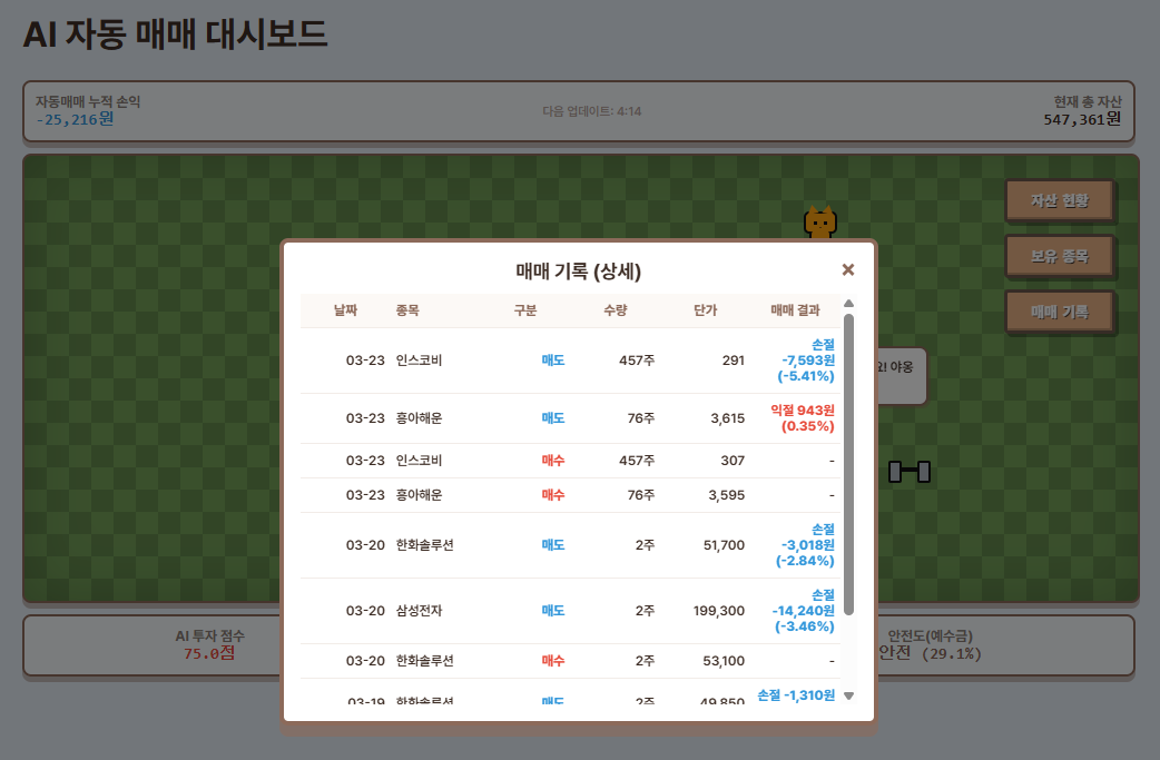 자동매매 수익!!!! 드디어 달콤한 AI 카테고리: 일반 | 작성자: 운영자 | 작성일: 2026.03.23 20:32 드디어 ai 자동매매로 수익을 봤습니다!! 흥아~~~ 해운이란 종목이구요. 정말 달달하네요 ㅎㅎㅎ 하지만 인스코비로 바로 다시 7천원 손절을 해버리는 짜식.. 모니터링 하면서 프롬프트를 수정하면 차차 나아지겠죠! 여러분들도 https://커피내기.com/주식 에 접속하여 확인해보세요 ㅎㅎㅎ 추천/비추천은 로그인 후 가능합니다. (추천: 1 / 비추천: 0)
